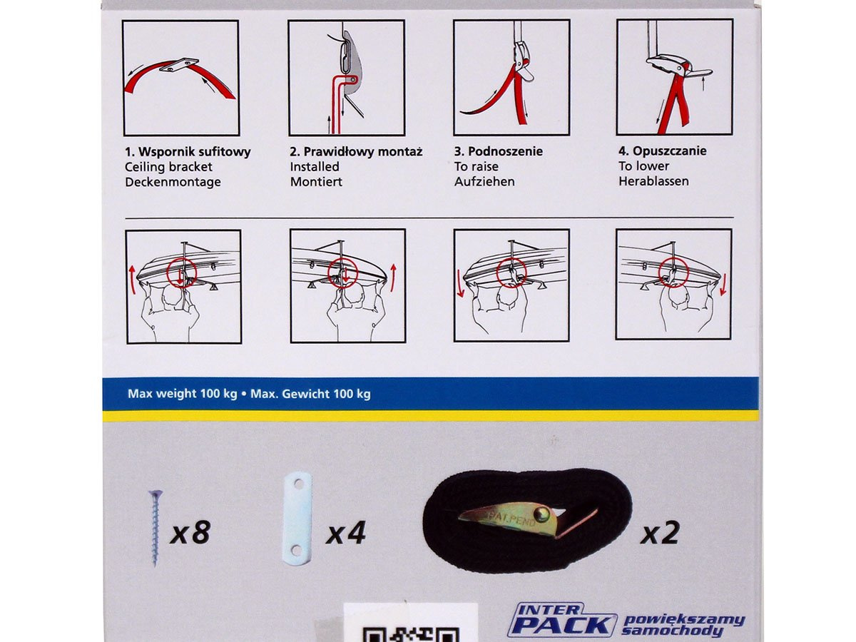 - Az Inter Pack mennyezeti tartó a tetőboxhoz tökéletes megoldás azok számára, akik teljes mértékben ki szeretnék használni a garázs, a háztartási helyiség vagy a pince mennyezete alatti teret.