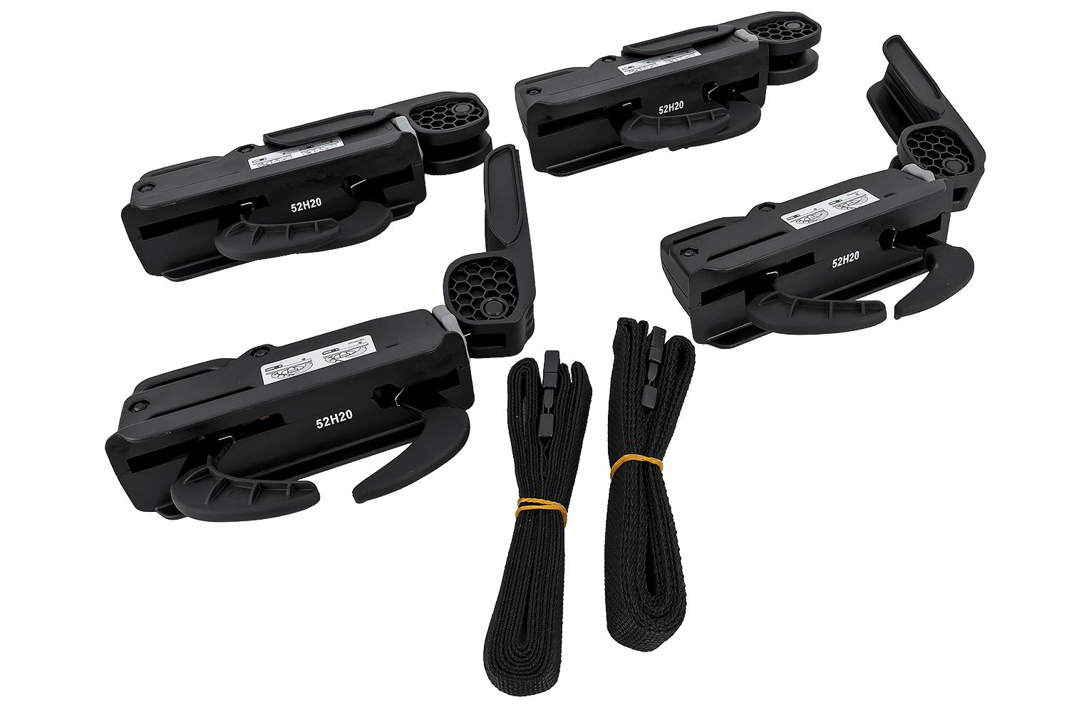 A készlet textil hevedereket tartalmaz, amelyek a dobozban található erre a célra szolgáló tartókba rögzíthetők, hogy szállítás közben biztonságosan rögzítsék a poggyászt.