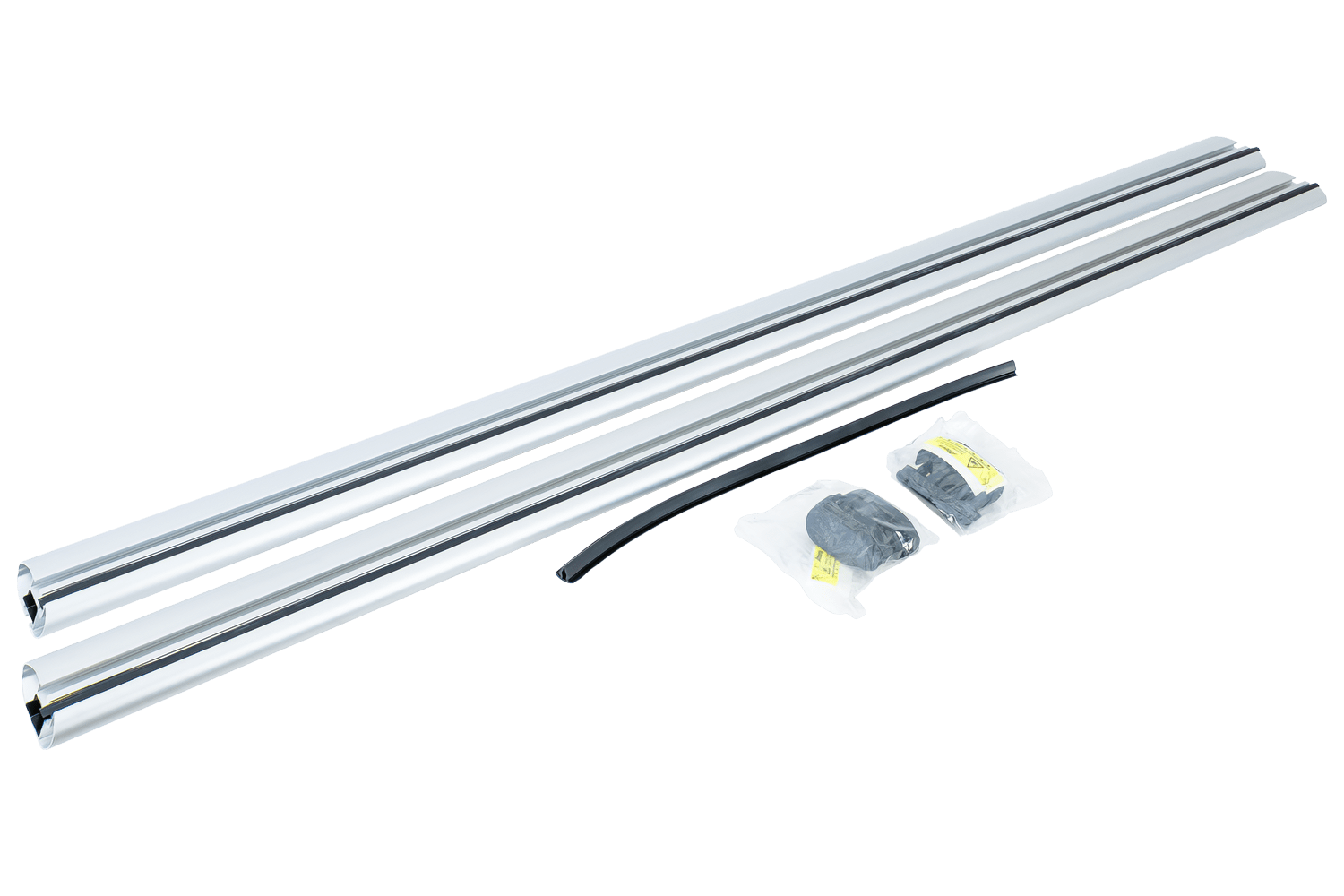 - Aerodinamikus alumínium rudakkal ellátott állvány. A készlet tartalmaz egy rudat + 4 rögzítőlábat – egyszerűen helyezze a lábakat a rudakra, és rögzítse az állványt a korláthoz a minden készlethez mellékelt speciális "kulcs" segítségével.