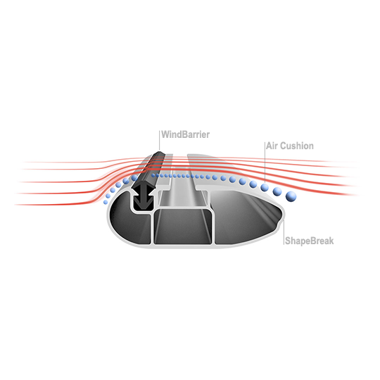 Ezenkívül a WindBarrier apró örvényeket hoz létre, légpárnát képezve a kereszttartó felületén, amely hídként működik a légáramlás számára a T-horony felett, megakadályozva a zajt minden vezetési körülmény között. Még tehermentes állapotban sem kell letakarni a hornyot a zaj megelőzése érdekében.