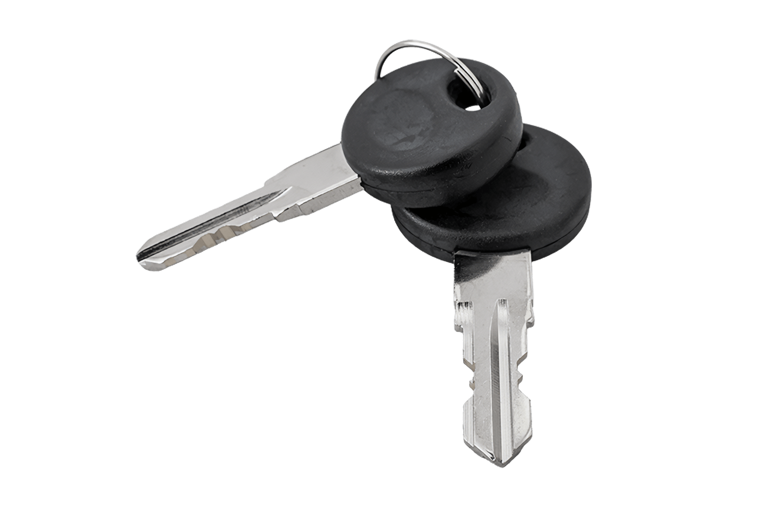 Biztonsági gomb kulcsok és egy azonos számú zár a kúpos rögzítőrendszerhez az Inter Pack vonóhoroghoz való kerékpárplatformokban.