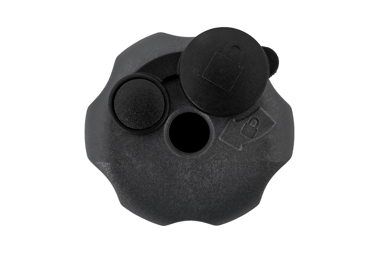 Biztonsági gomb azonos számú kulccsal és zárral az Inter Pack vonóhorogra szerelt kerékpárplatformok kúpos rögzítőrendszeréhez.