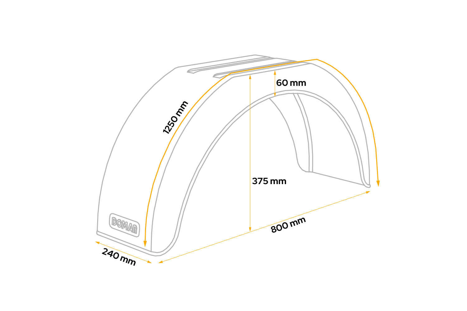 - A 15 és 16 colos kerekekhez tervezett D20140 DOMAR szimpla sárvédő 800 mm hosszú és 240 mm széles. Megvédi a pótkocsit és a rakományt a mechanikai sérülésektől, valamint a többi közlekedőt a sártól és a kavicsfelverődésektől.