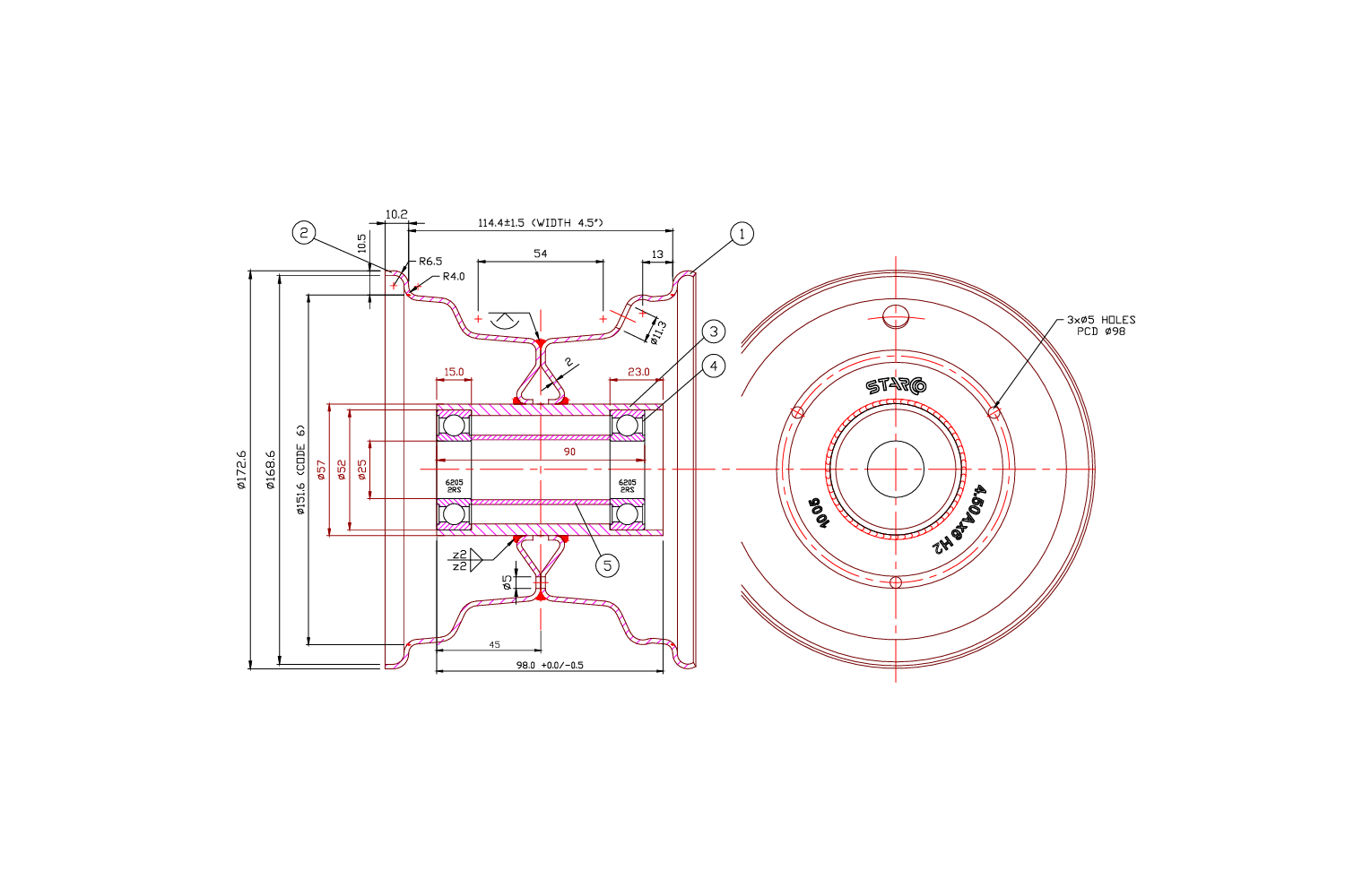 STARCO acél felni 4.50A×6" H2 3x98 6205-2RS csapágyakkal