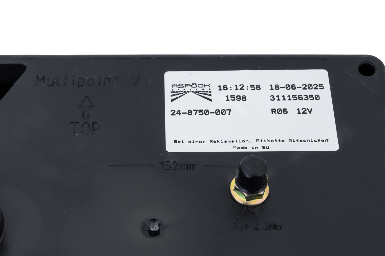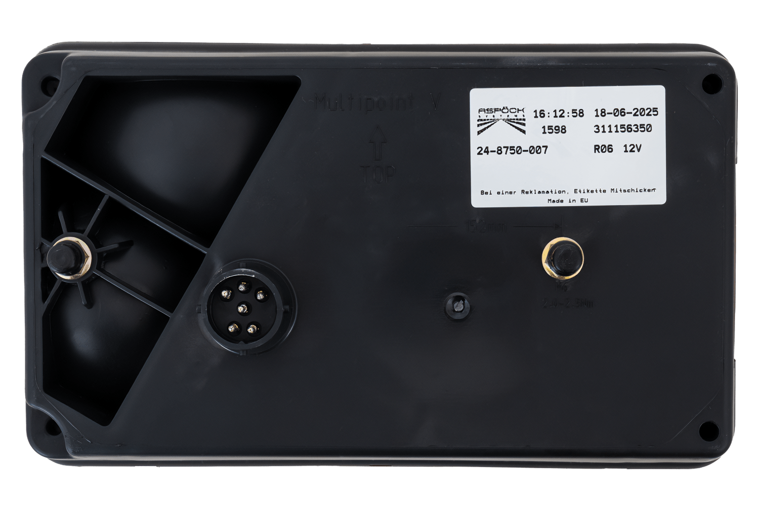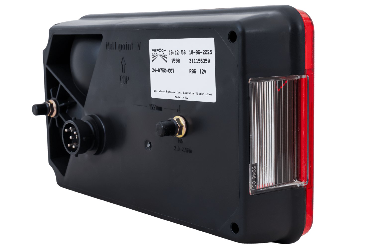 Az ASPÖCK Multipoint V hátsó lámpa a jármű jobb oldalára való felszerelésre készült. Méretei: szélesség 238 mm, magasság 140 mm, mélység 55 mm . 8 tűs bajonettzárral felszerelve, gyors és egyszerű felszerelést tesz lehetővé. pótkocsikban, buszokban vagy pótkocsikban .