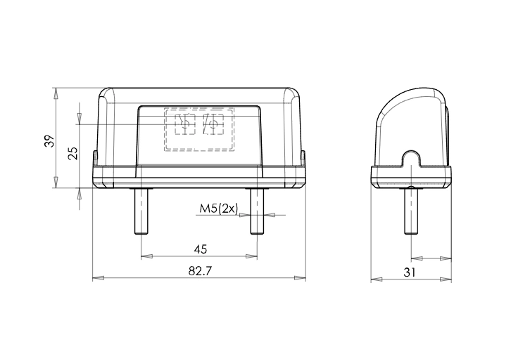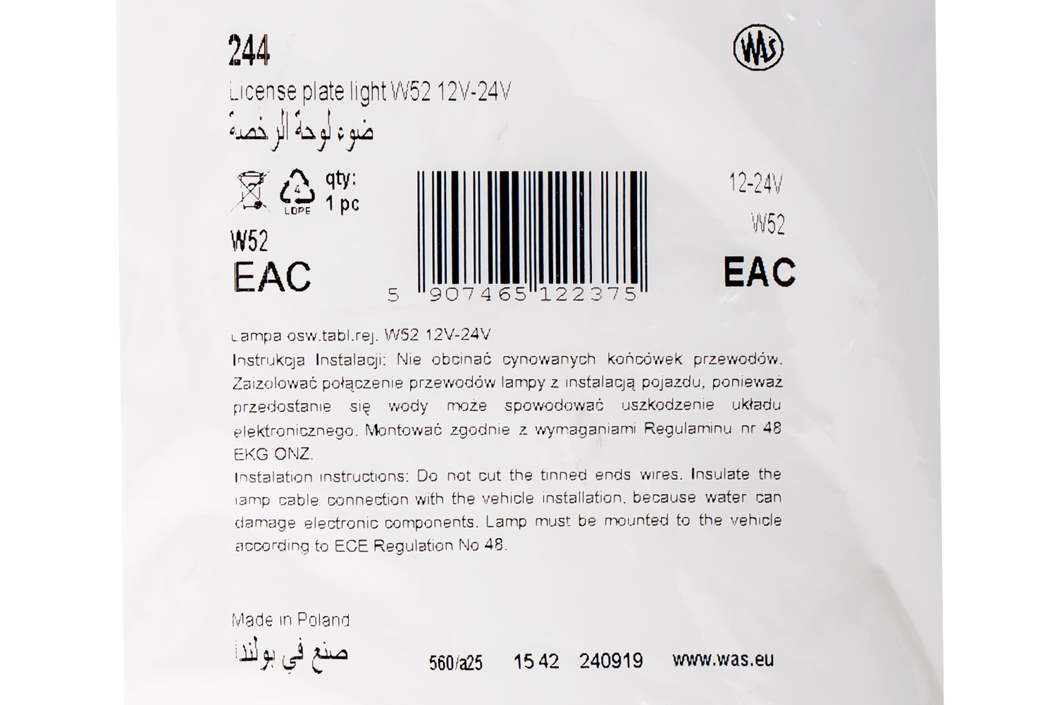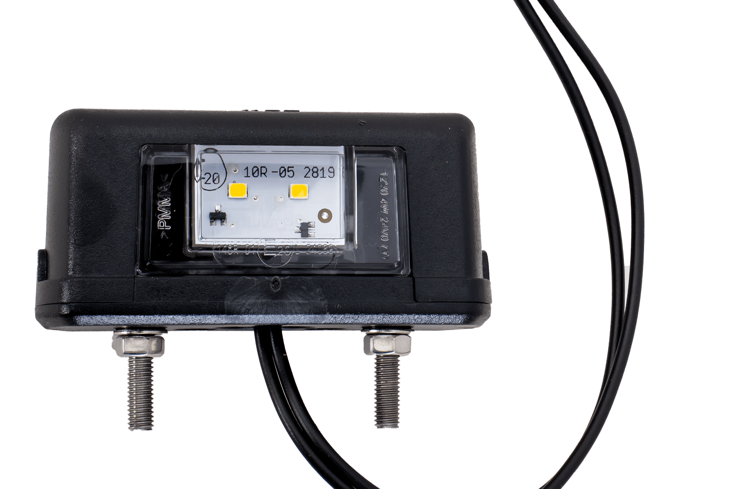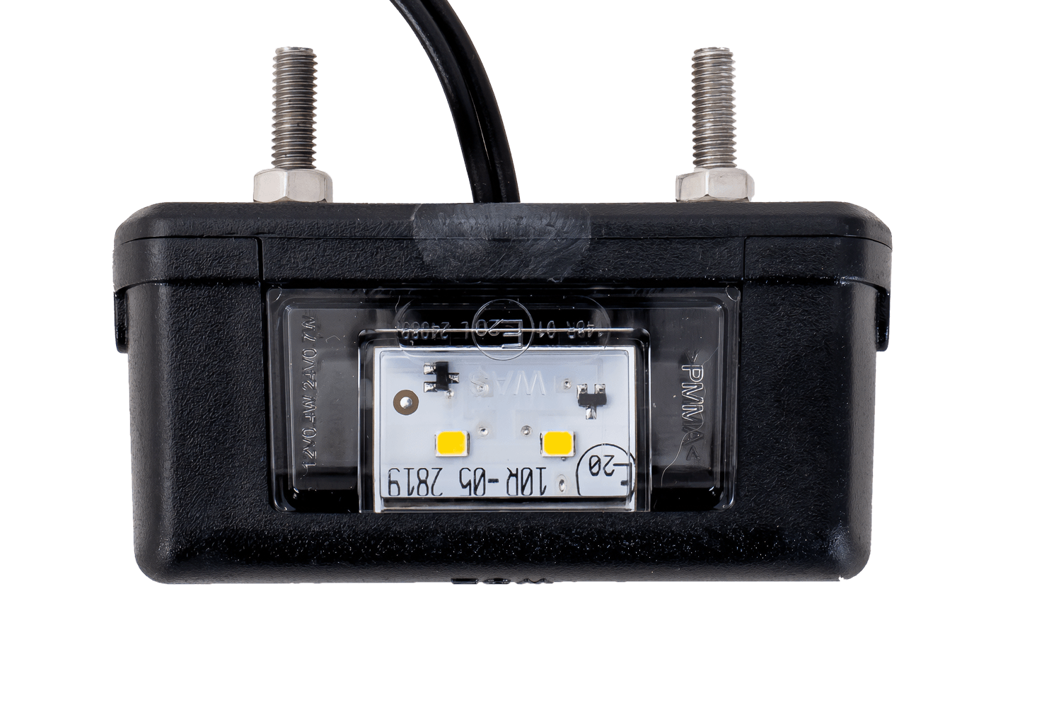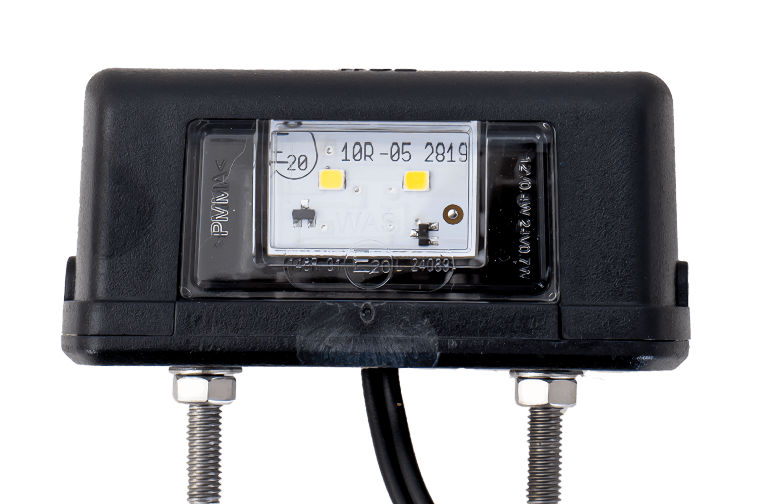 - Ez a WAŚ rendszámtábla-világítás, két LED-del felszerelve, 12 V és 24 V közötti feszültségtartományban működik. 20 cm-es egyenáramú kábellel rendelkezik a könnyű telepítés és a jármű elektromos rendszeréhez való rugalmas csatlakoztatás érdekében.