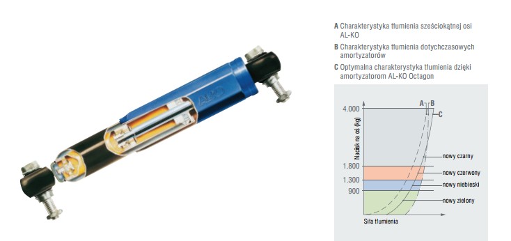 A piros AL-KO OCTAGON nyolcszögletű lengéscsillapítót az utánfutó kezelhetőségének optimális javítására tervezték. Kiküszöböli az utánfutó veszélyes rázkódását, amely minden sofőrt megkeserít. Ez simább utazást , megbízhatóbb fékezést és optimális útfelület-érintkezést jelent. A piros AL-KO lengéscsillapítókat 1800 kg súlyú egyes tengelyekhez és 3500 kg súlyú tandem tengelyekhez tervezték.